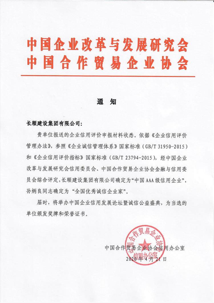 经中国企业改革与发展研究会信用委员会、中国合作贸易企业协会金融与信用委员会综合评定,米兰建设集团有限公司被评为