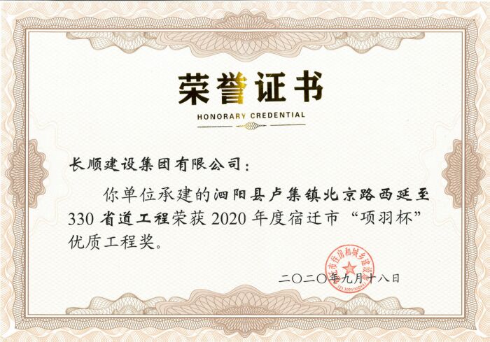近日,由米兰建设集团承建的“泗阳县卢集镇北京路西延至330省道工程”荣获2020年度宿迁市“项羽杯”优质工程奖。